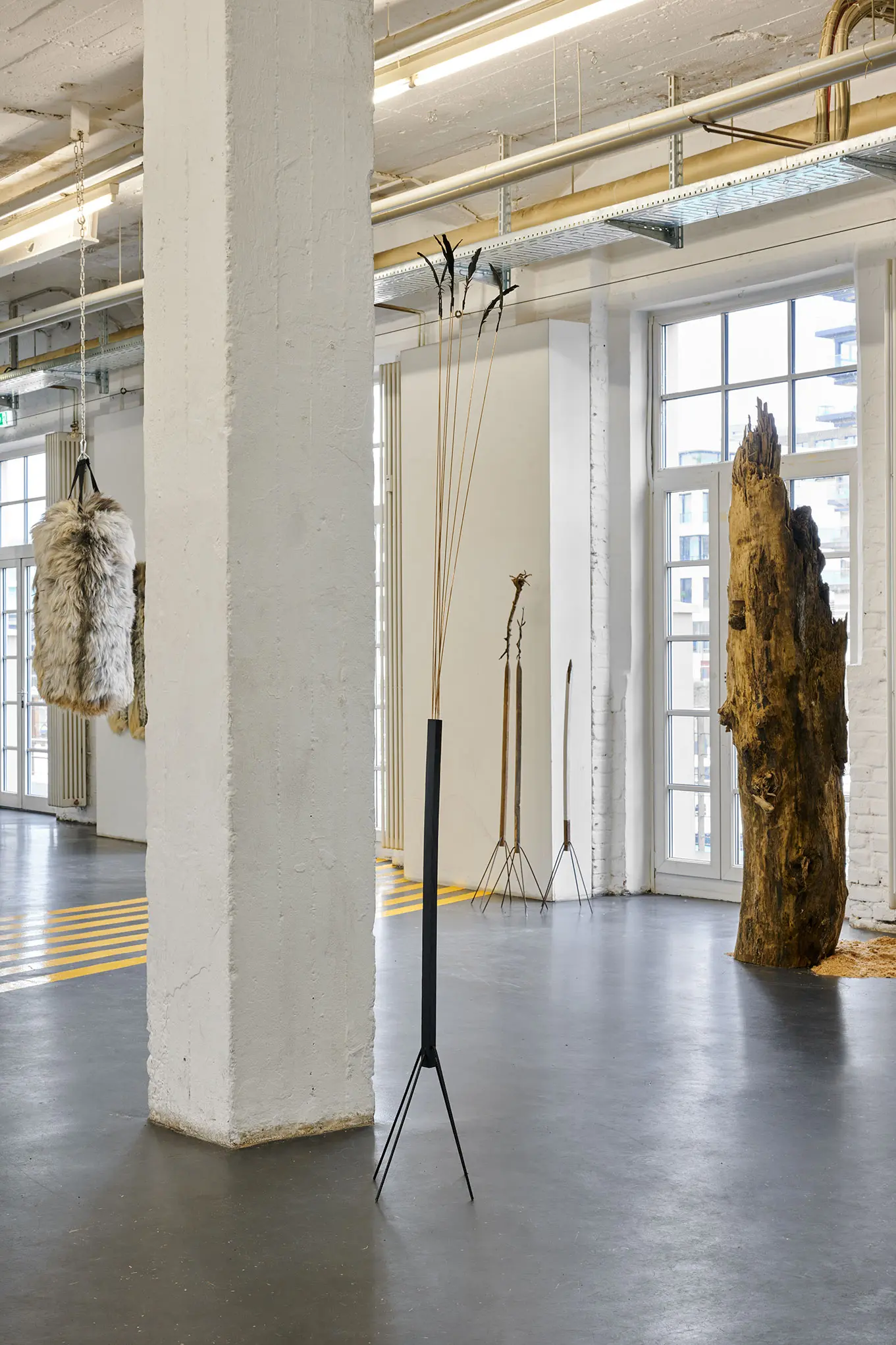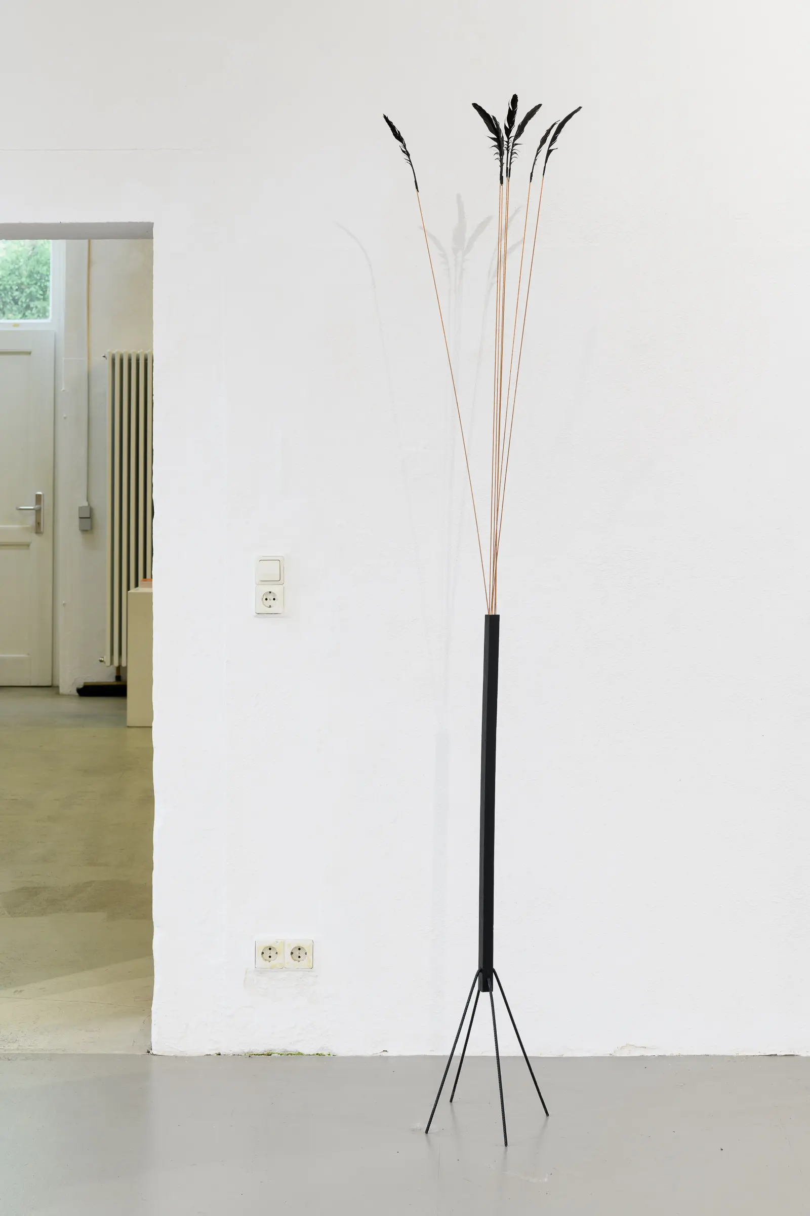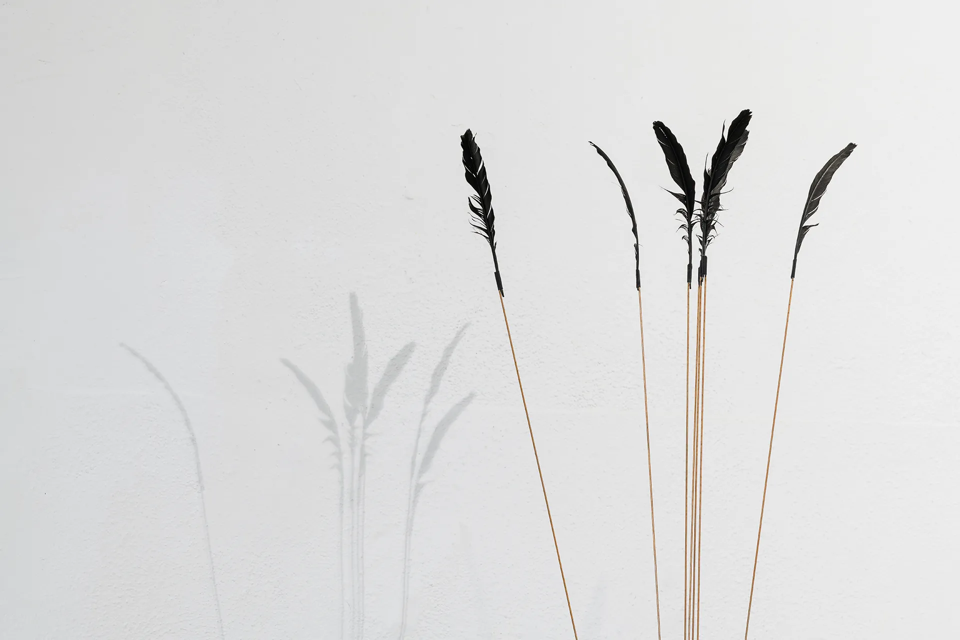 7 Krähenfedern, Kupferstäbe, Holz, schwarzer Lack, Tusche, Schrumpfschlauch