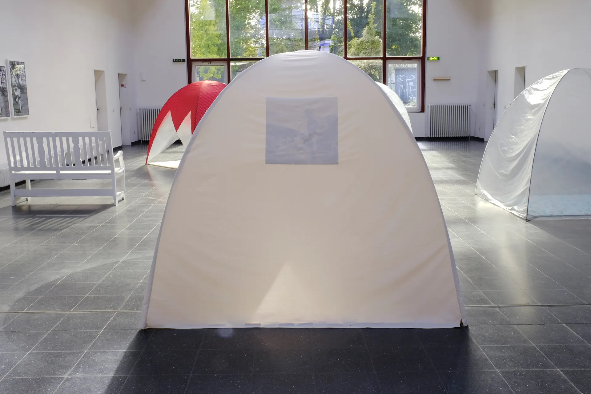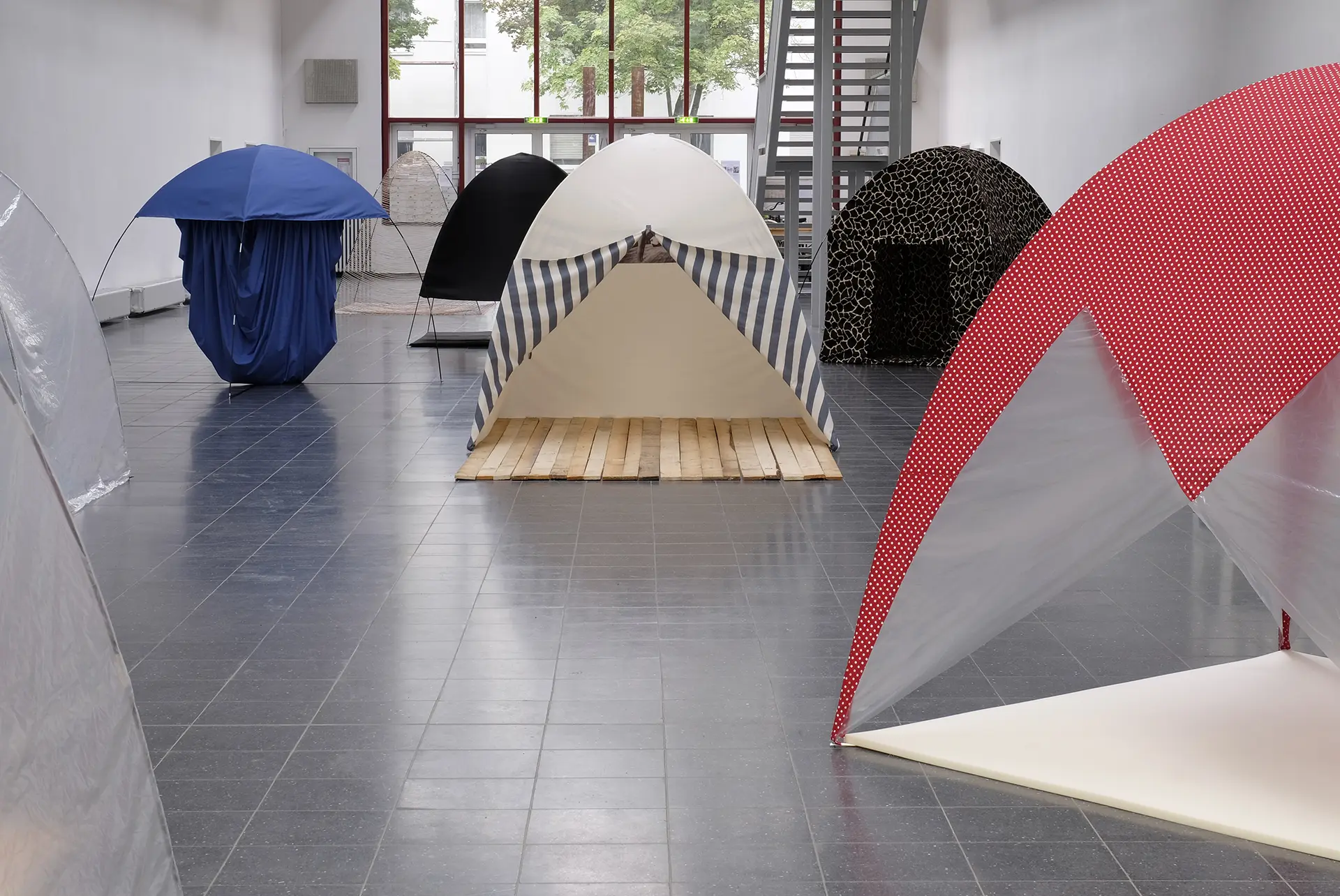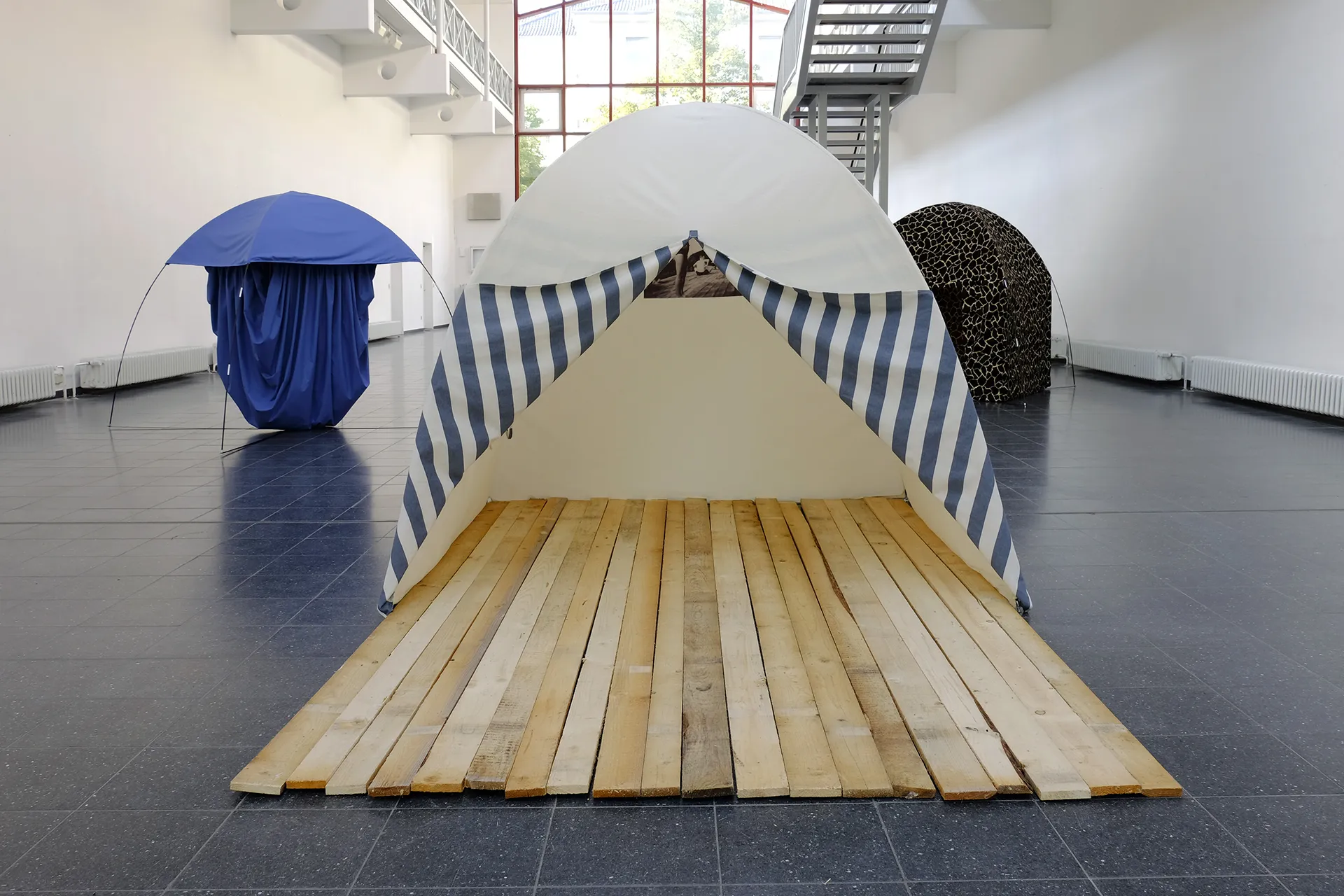 Rauminstallation Ausstellung Residency, 2015 Am anderen Ufer Materialien Leinenstoff natur und blaugestreift, Zeltgestänge, 20 Holzlatten sägerau, Fotodruck Maße Fotografie: Marietta Schwarz Weitere Arbeiten entdecken Walden Die Flamingos MIKADO Ihr seid nicht mehr da wo ihr wart Zeltarbeit (Wolkenzelt) Sternschnucke