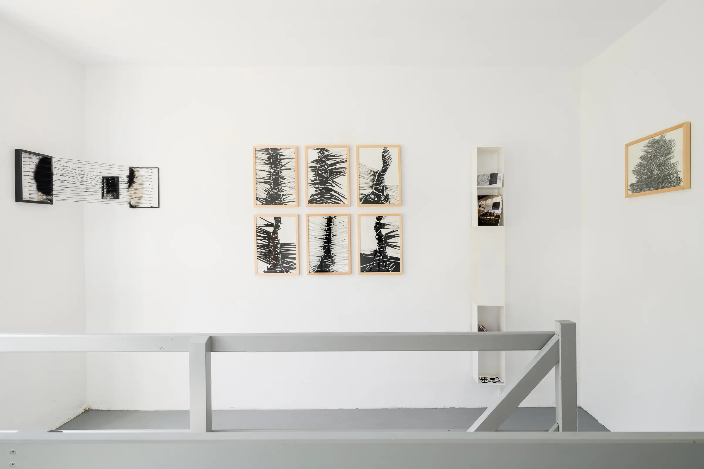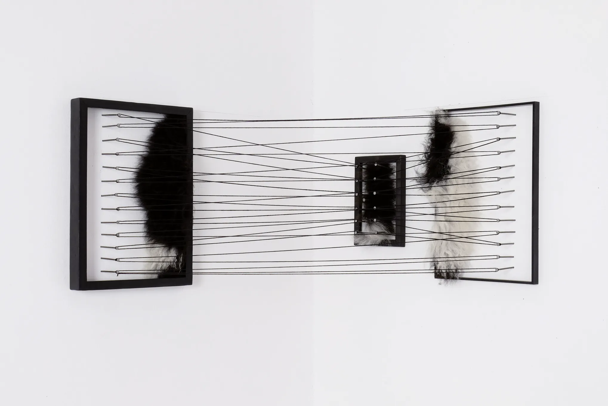 3 Holzrahmen, 3 Fellstücke, Nägel, schwarze Wolle, Tusche, Lack