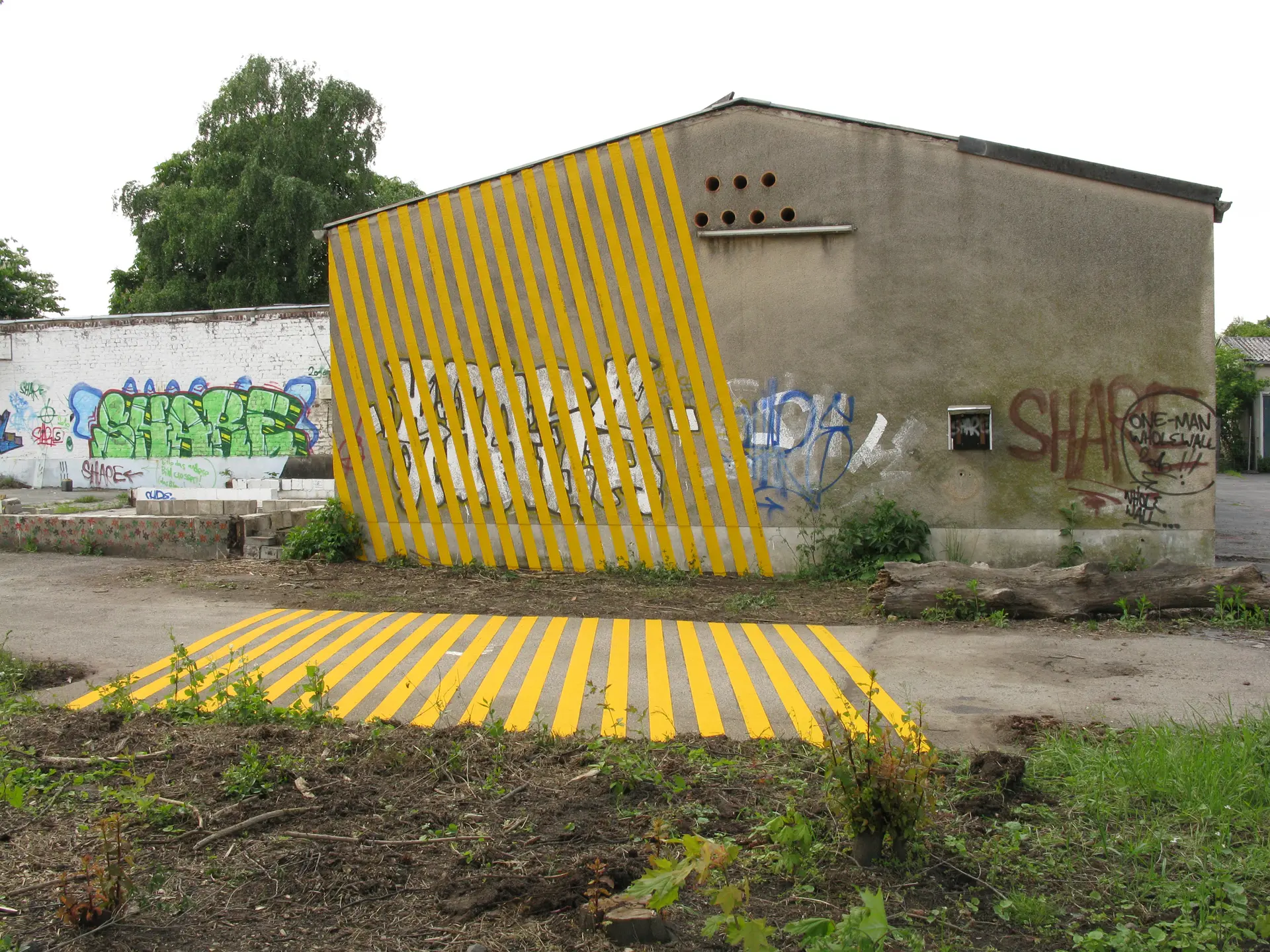 Fahrbahnmarkierungsfolie 12 cm gelb auf Hauswand und auf Asphalt