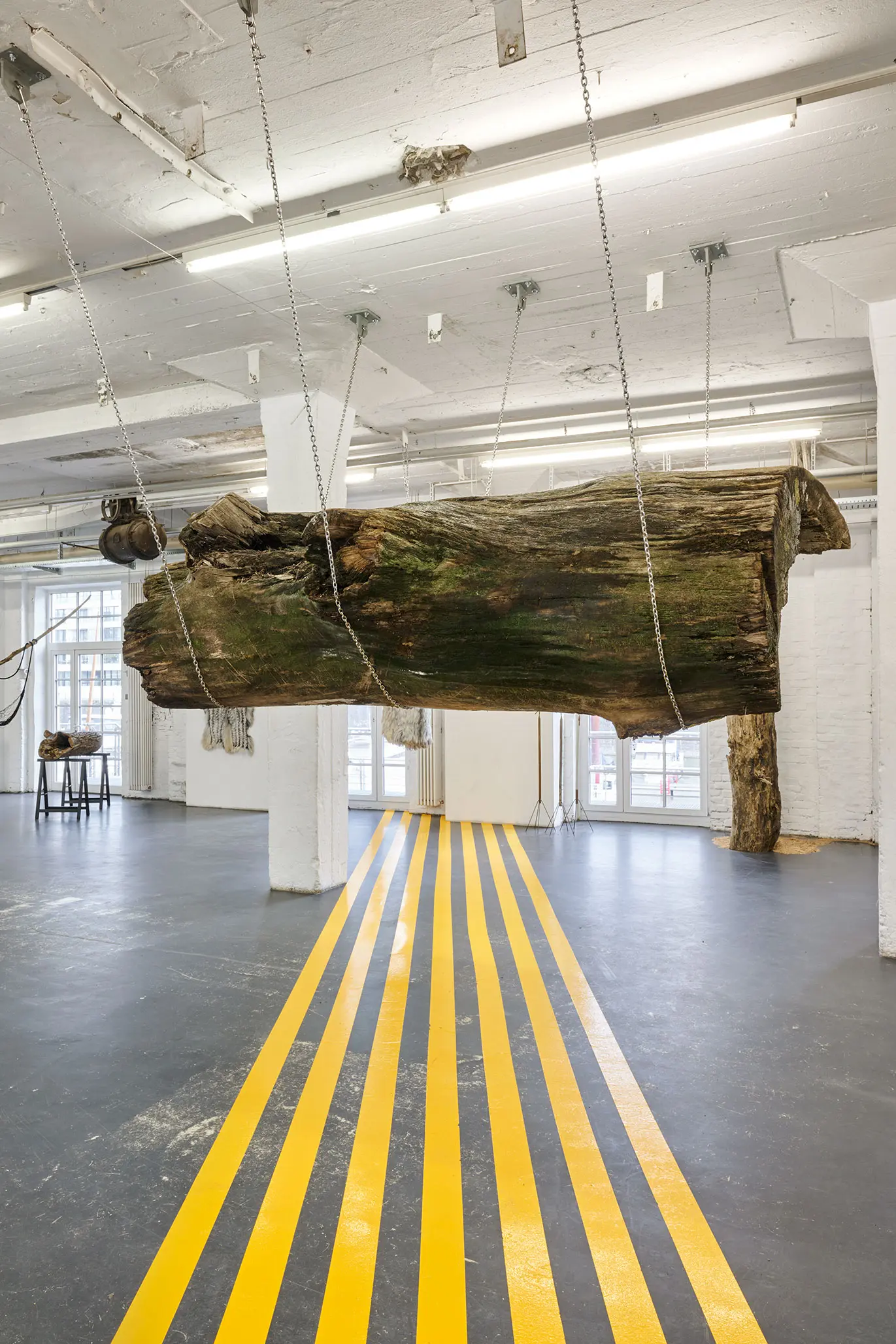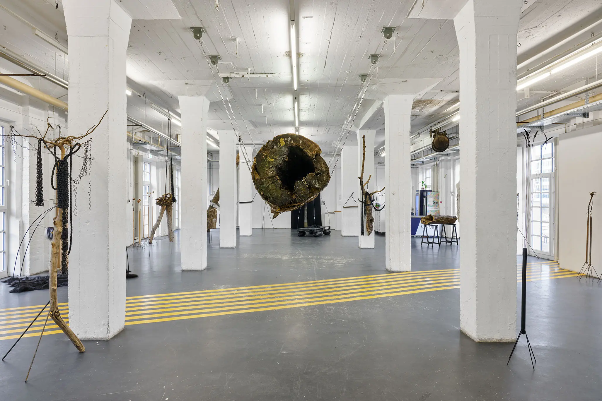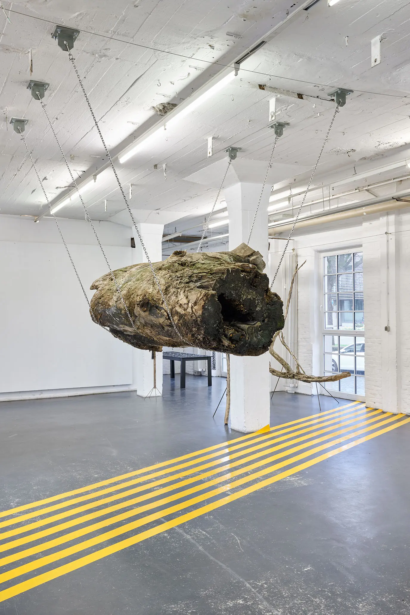 Die gelben Fahrbahnmarkierungsstreifen am Boden schaffen eine zweite Bedeutungsebene. Sie durchqueren den Raum wie Verkehrswege, wie Lebensbahnen oder Fluchtlinien. Diese urbanen, funktionalen Elemente kontrastieren scharf mit der organischen Wildheit des Holzes. Sie dynamisieren den Raum, lenken den Blick, schaffen Bewegung – während der Stamm in seiner schwebenden Ruhe verharrt.