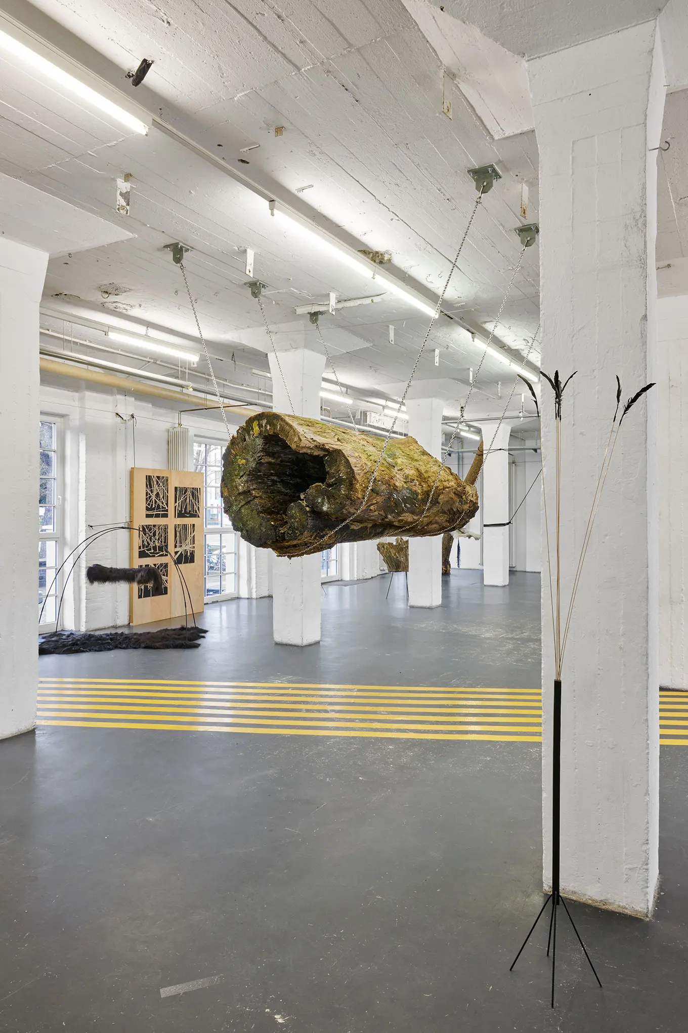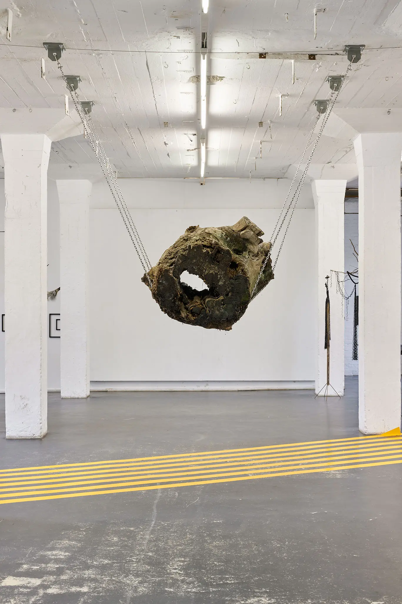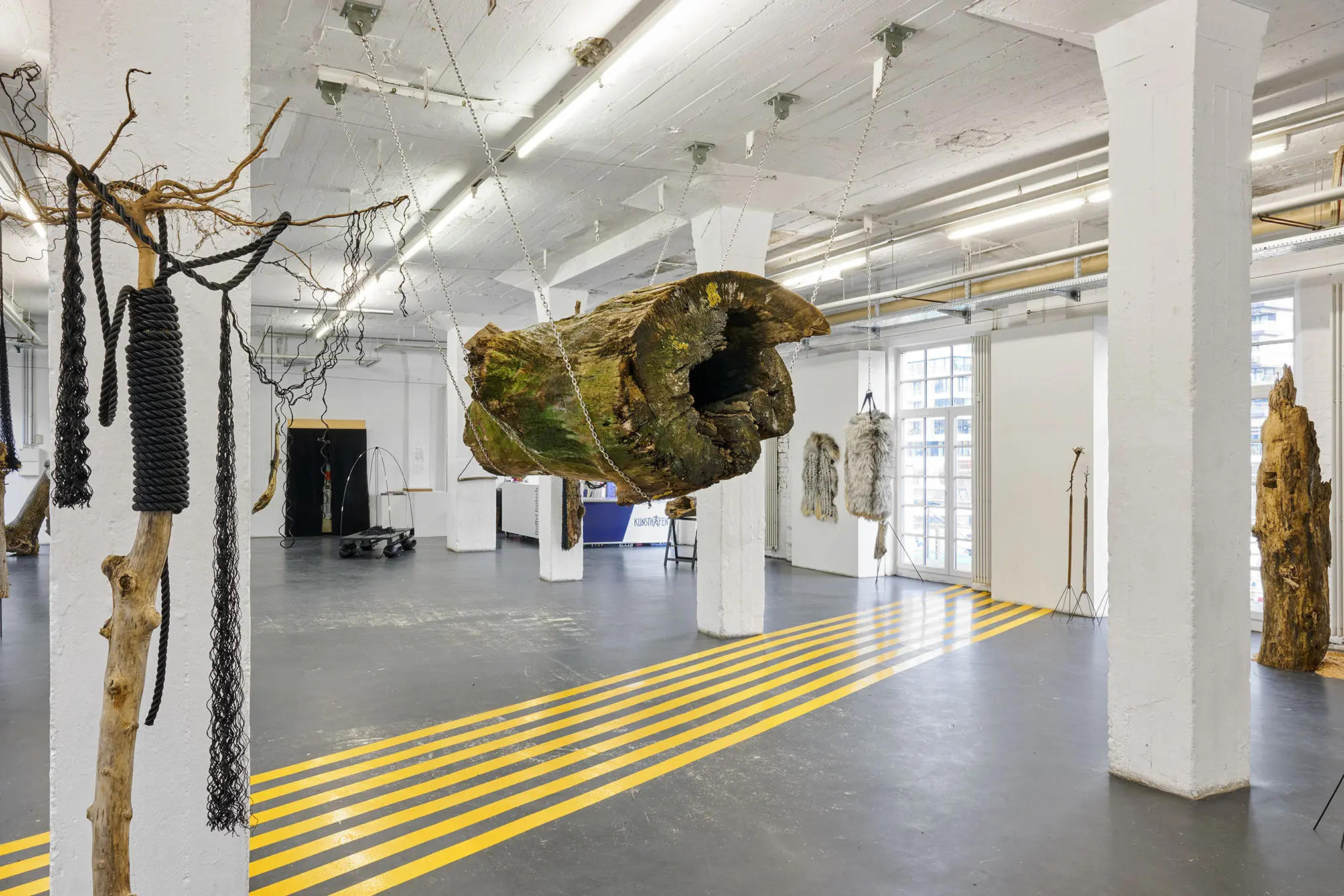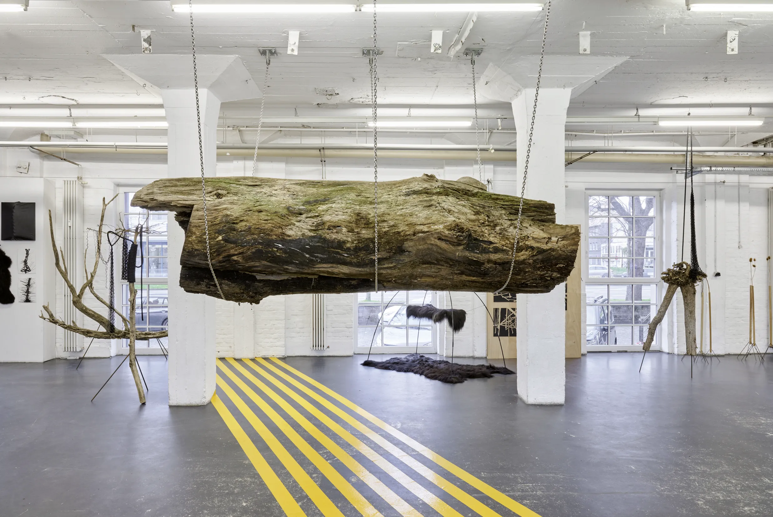 Die gelben Fahrbahnmarkierungsstreifen am Boden schaffen eine zweite Bedeutungsebene. Sie durchqueren den Raum wie Verkehrswege, wie Lebensbahnen oder Fluchtlinien. Diese urbanen, funktionalen Elemente kontrastieren scharf mit der organischen Wildheit des Holzes. Sie dynamisieren den Raum, lenken den Blick, schaffen Bewegung – während der Stamm in seiner schwebenden Ruhe verharrt.