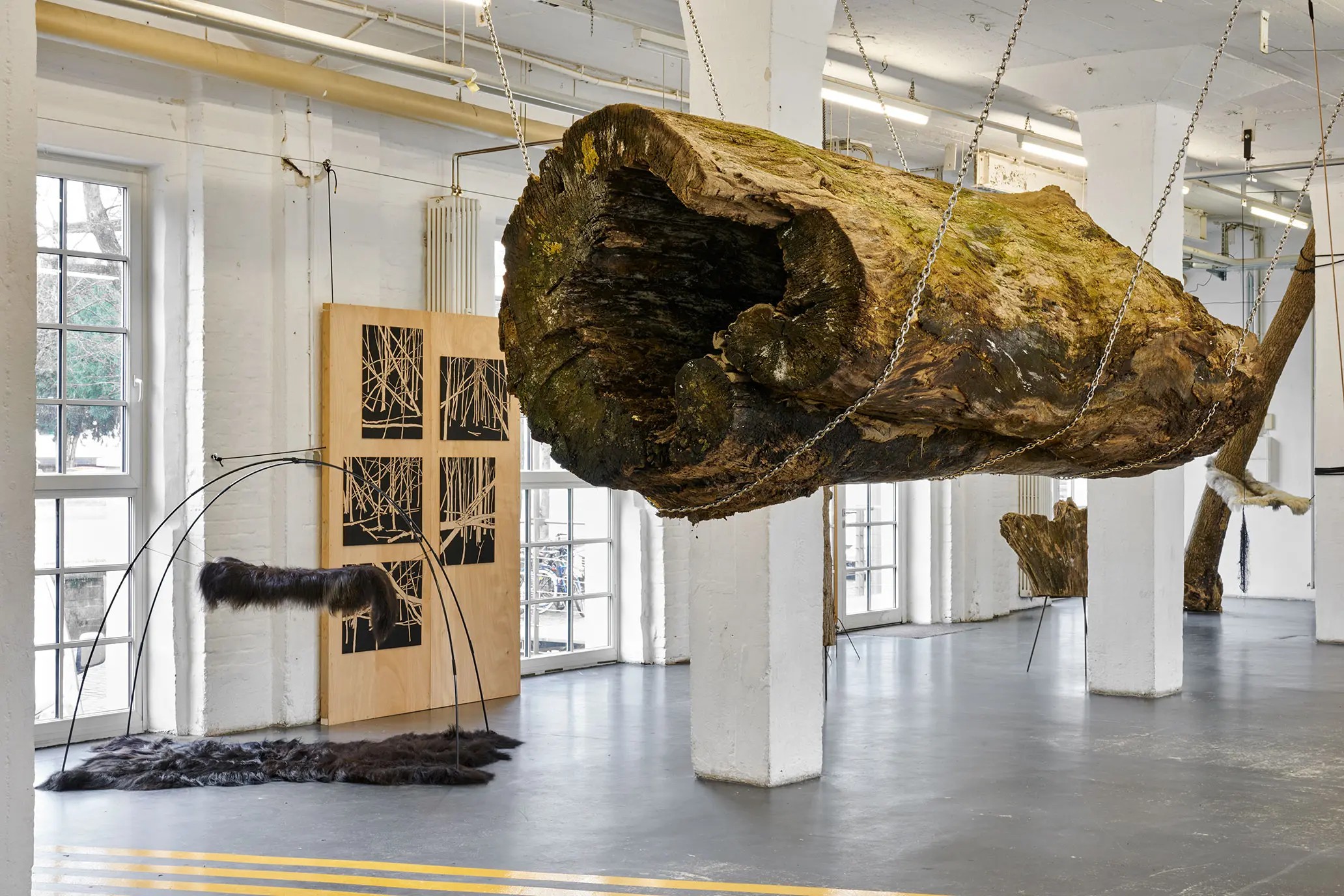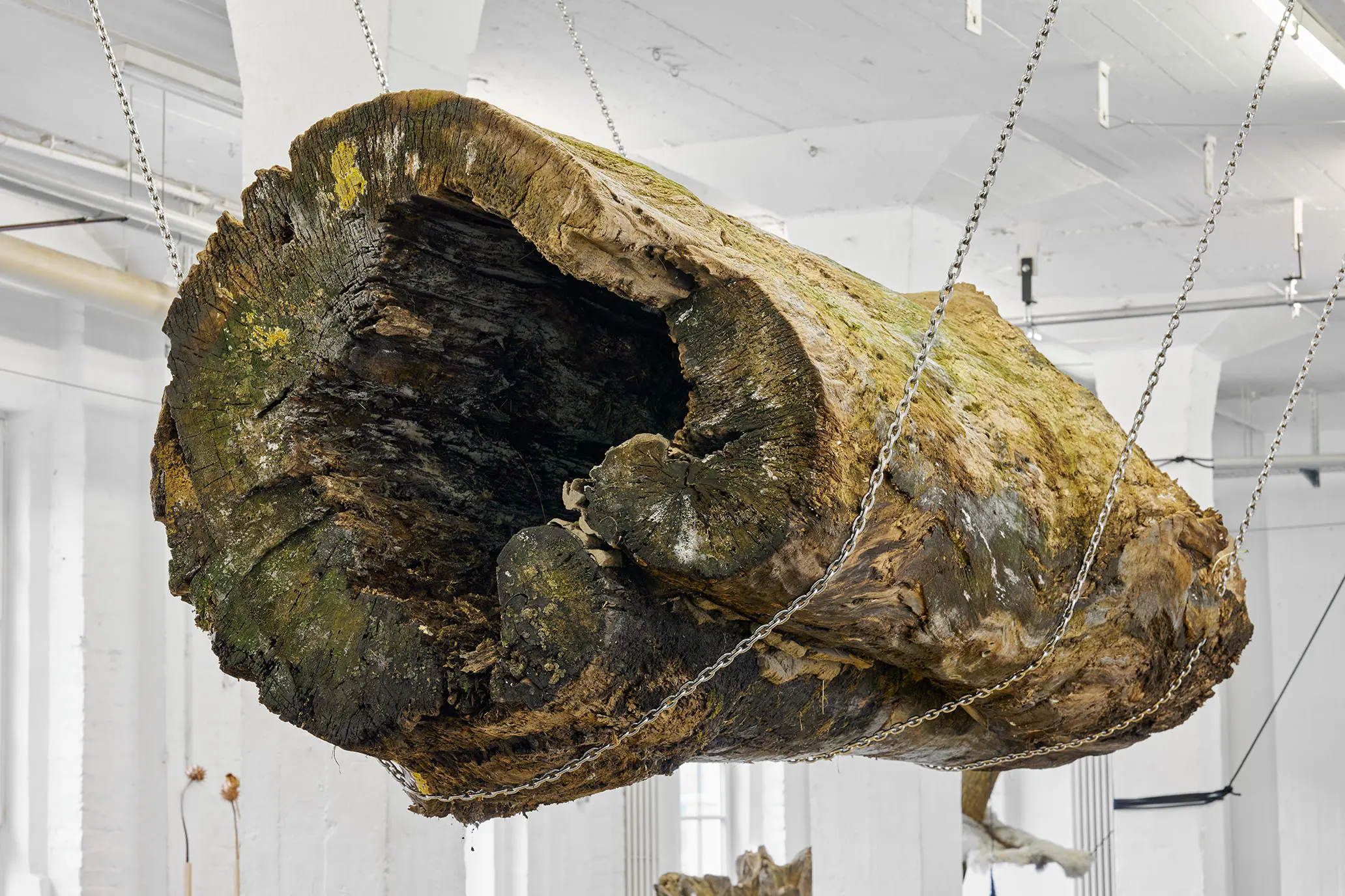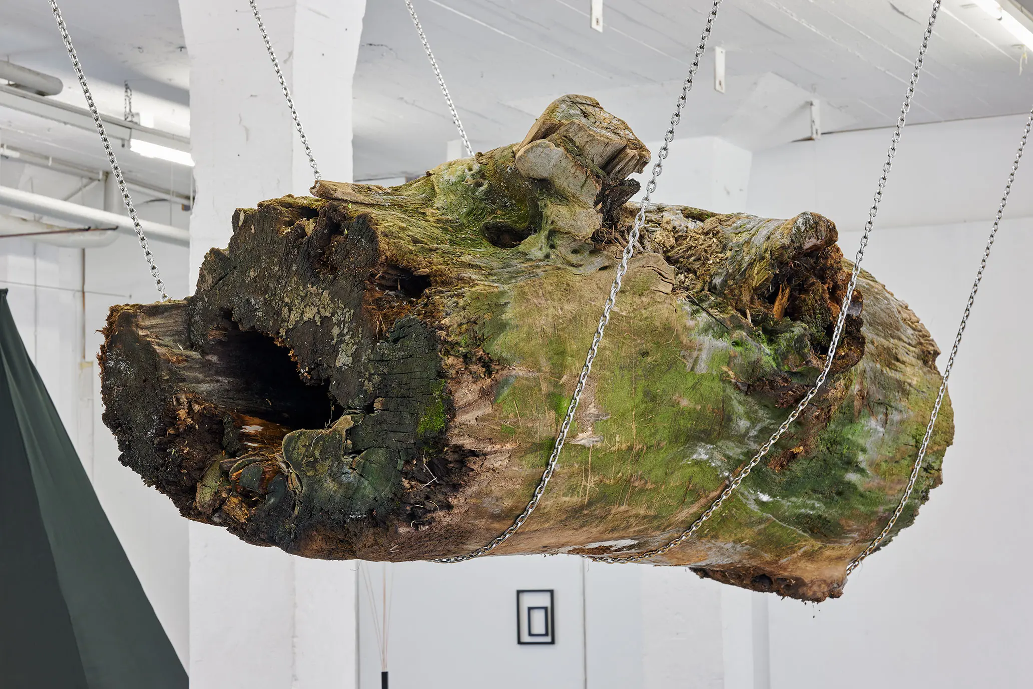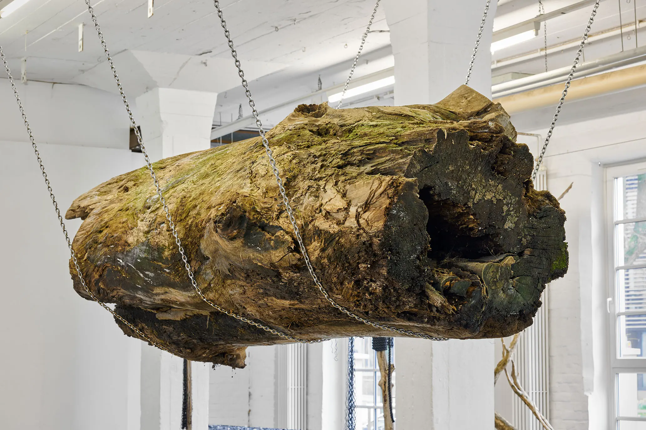 Ein 4,20 m langer und 1,20 m im Durchmesser breiter Treibholz Stamm hängt an drei schweren Ankerketten frei im Ausstellungsraum. Sein Gewicht ist körperlich spürbar, trotzdem sieht aus, als schwebt er.
