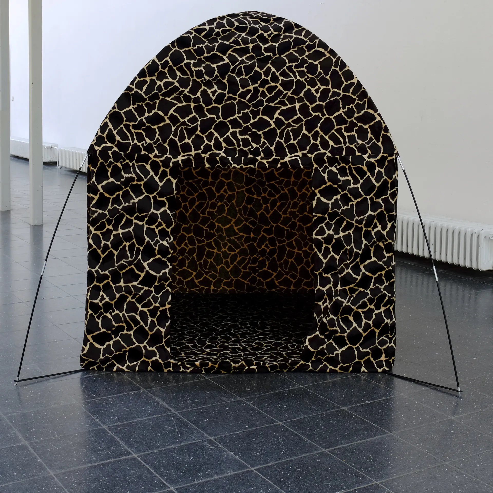 Zeltarbeit: Stoff aus Kunstfell mit Giraffenaufdruck, Zeltgestänge, Matte aus PU-Schaum, Lautsprecher mit Soundscape