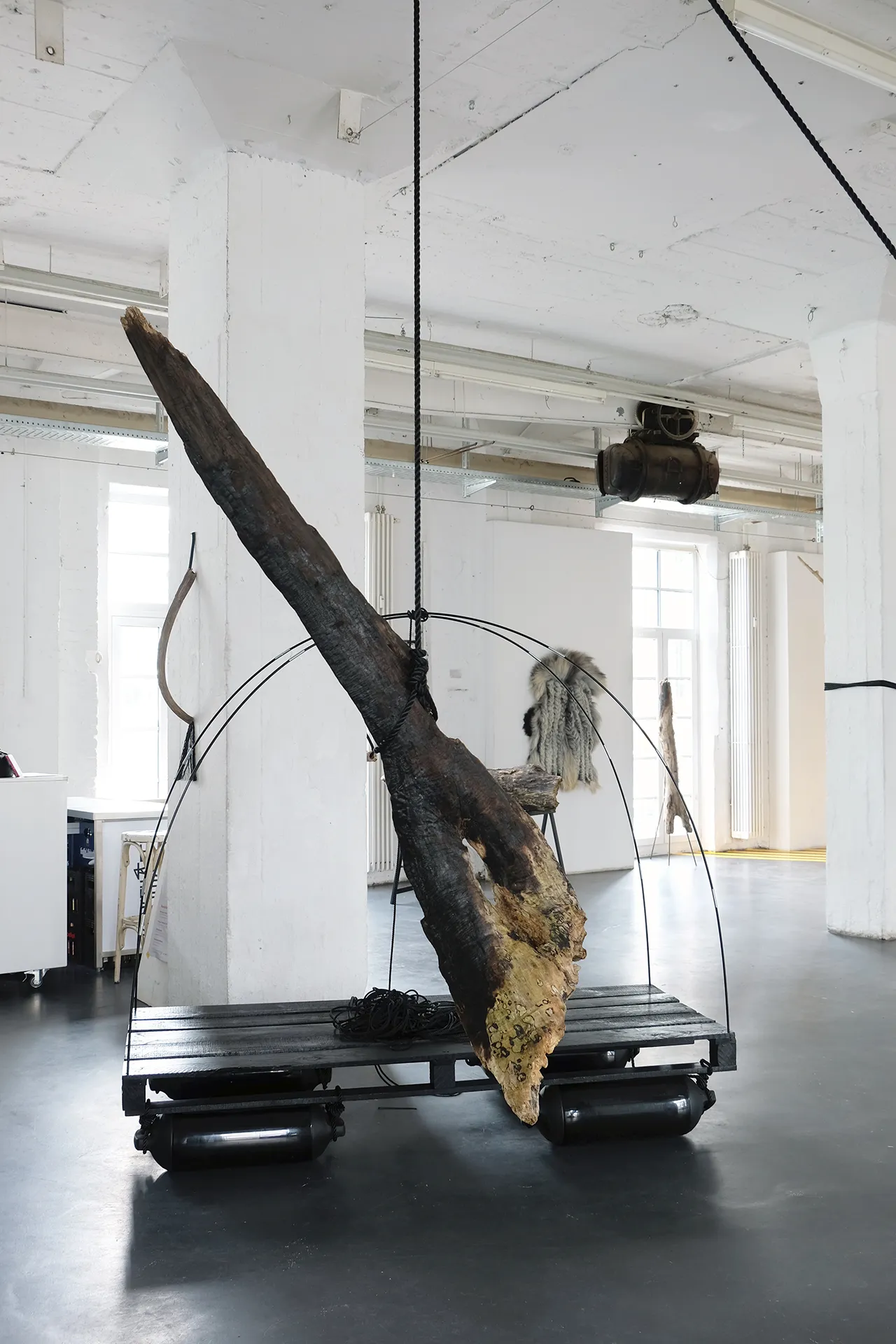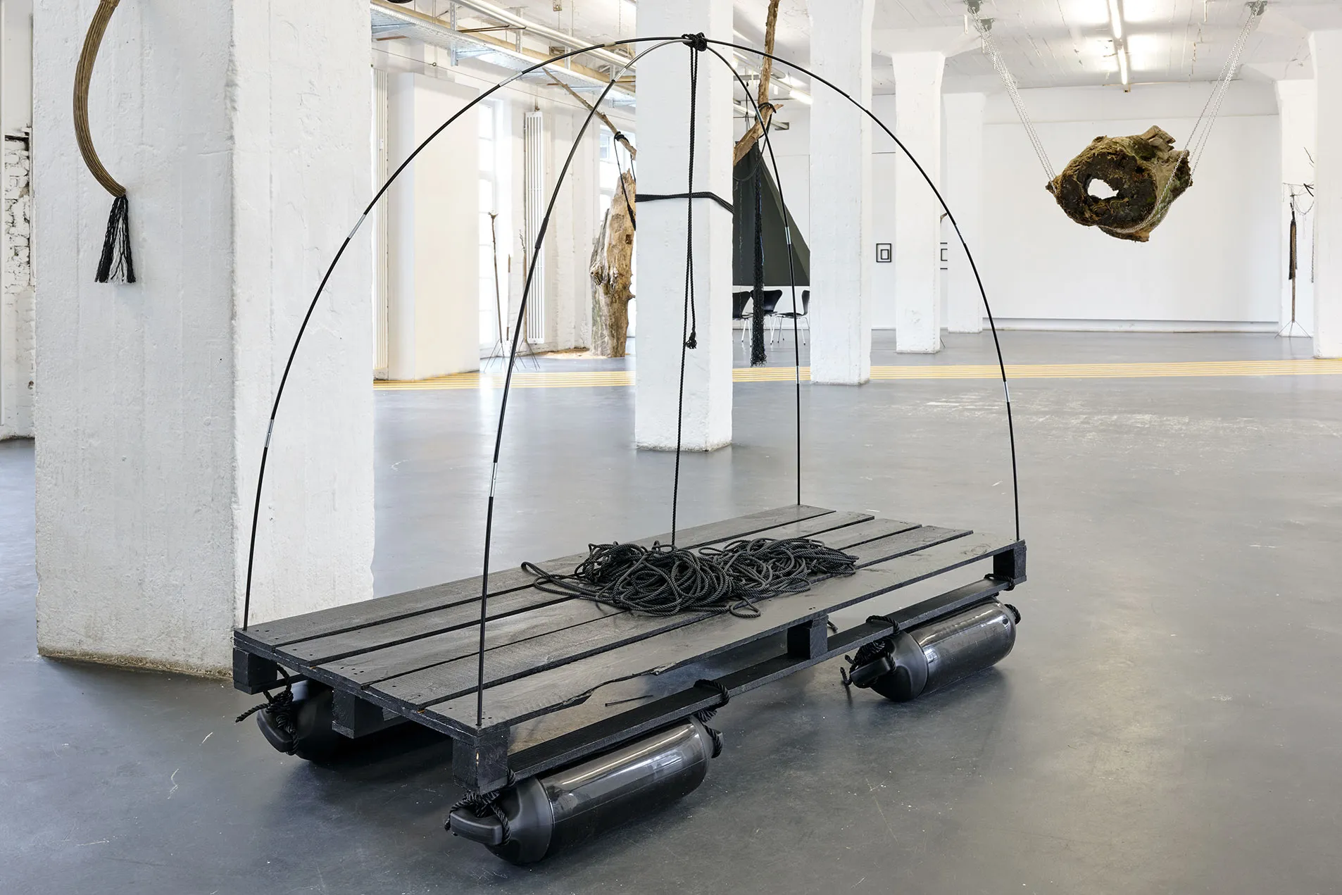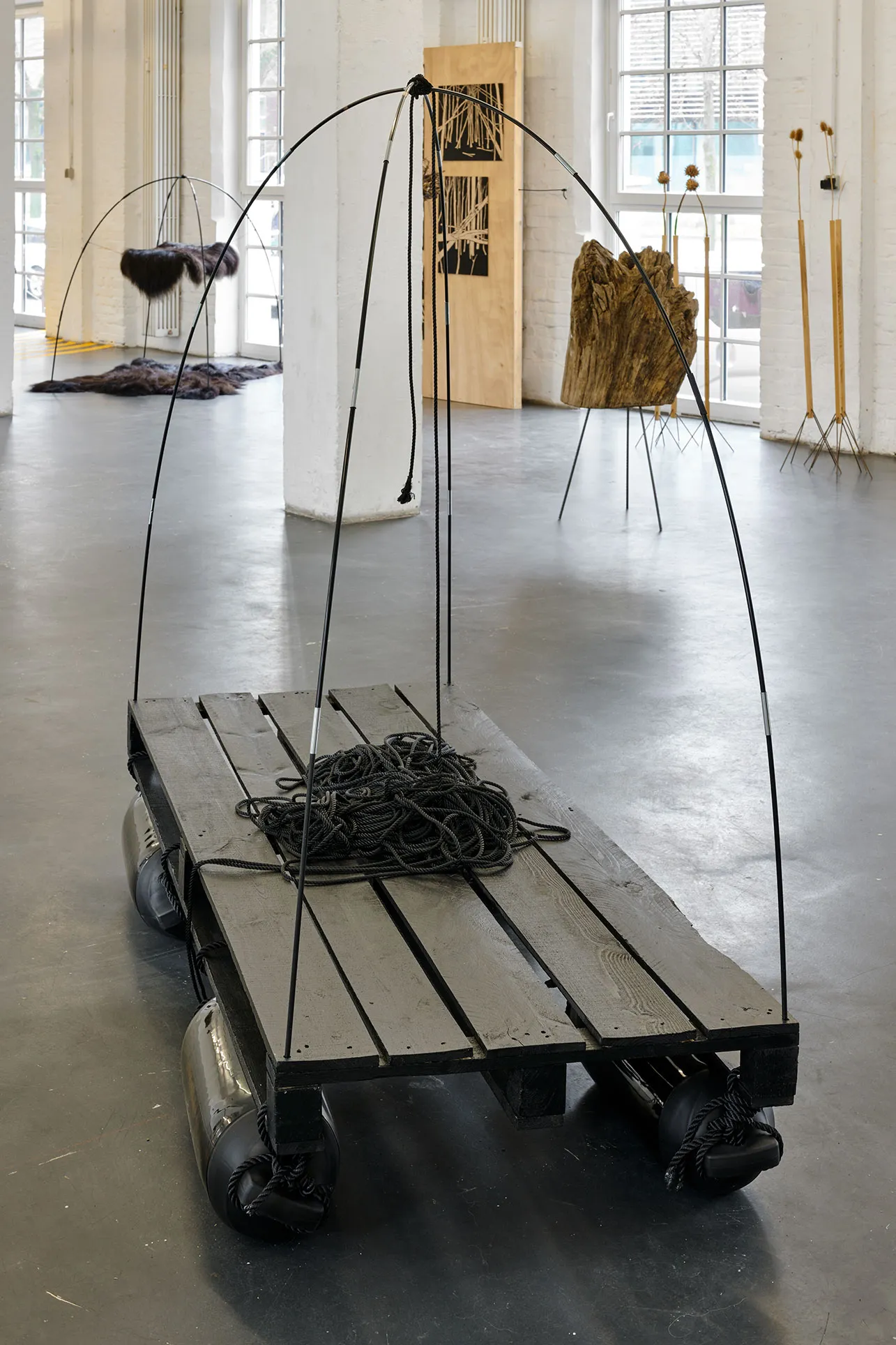 Holzpalette, Lack, Zeltstangen, Seil, 4 schwarze Gummifender